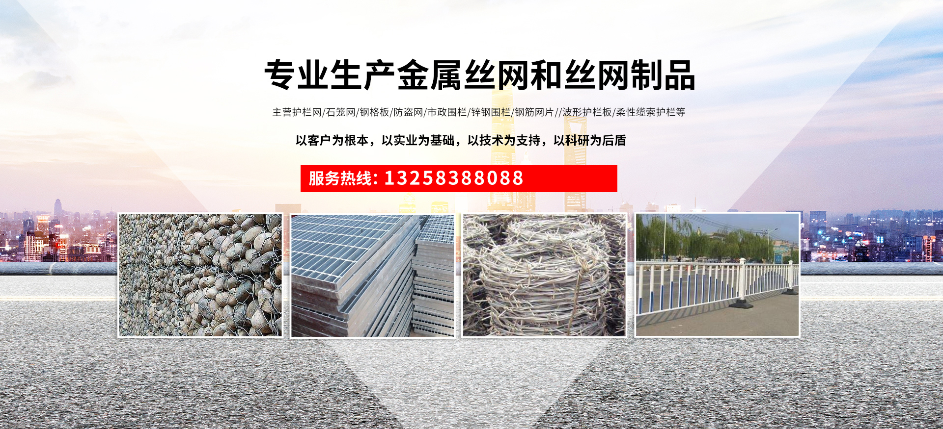 成都宏旭金屬絲網制造有限公司主營護欄網系列、石籠網系列、鋼格板、防盜網、市政圍欄、鋅鋼圍欄、鋼筋網片、聲屏障系列、波形護欄板、柔性纜索護欄、SNS邊坡防護網等其他絲網類產品。特殊規格可加工定做,也可根據客戶來圖來樣定做。自創業以來,公司一直堅持市場為導向,以客戶為根本,以實業為基礎,以技術為支持,以科研為后盾,集科研、生產、經營為一體,不斷研制開發新產品,開拓市場,走綜合發展之路。多年來,公司憑借過硬的質量,良好的信譽、優質的服務、合理的價格,贏得了市場和商家的一致好評。